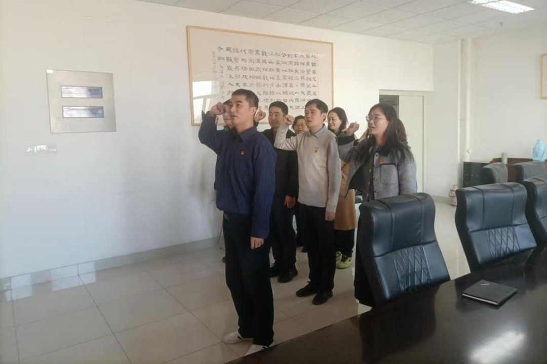 在鲜红的党旗前,支部书记樊祥宇带领新发展的预备党员王文波和支部其他党员,面向党旗,紧握右拳,庄严宣誓。这一神圣时刻,充分体现了新老党员对党组织的忠诚和对共产主义事业的坚定信念。宣誓仪式不仅是对新党员的政治洗礼,也为在场的教工党员注入了一股崭新的力量。
