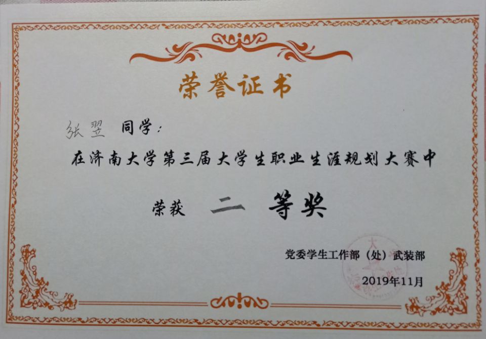 比赛自今年三月份启动以来,遵循“课程导入—专题指导—规划书制作—学院初选—学校复赛--精英集训—现场展示”的活动流程,聚焦于“示范-实训-反馈-增进”教育成长路径,分为学院初赛、学校复赛和学校决赛三个阶段。经过近半年的充分准备、层层选拔,我院2018级张翌同学从参赛选手中脱颖而出,进入决赛。决赛分为VCR视频能力展示、PPT规划展示以及现场答辩三个环节。张翌同学从自我认知、职业分析、职业定位、计划实施和评估调整五个方面详实展现了她的职业生涯规划书,特别是在现场答辩环节中,精准回答了评委老师的提问,展现了我院学子勤学求实的良好精神风貌,最终取得二等奖的好成绩。