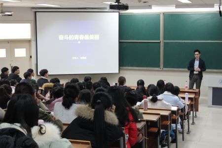 下午三点,活动正式开始。殷晟程以“奋斗的青春最美丽”为题向我院学生分享自身工作经验。首先,他以视频形式进行了简短的自我介绍,展现其在成为学生骨干路上的自我提升的历程。随后他分享了自己参与公务员选调生考试的经验,从公职类考试介绍、选调生考试、公务员考试以及历年考试题型、笔试面试技巧等方面做了详细讲解。