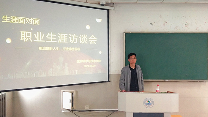 规划精彩人生,打造锦绣前程。为增加学生对生物制药就业方面的了解,4月11日下午,太阳成集团tyc33455在10J306举办职业生涯访谈会活动,邀请邦恩泰生物集团研发总裁刘磊教授来校宣讲。活动由学院辅导员阮斌主持,部分本科学生参加了此次活动。