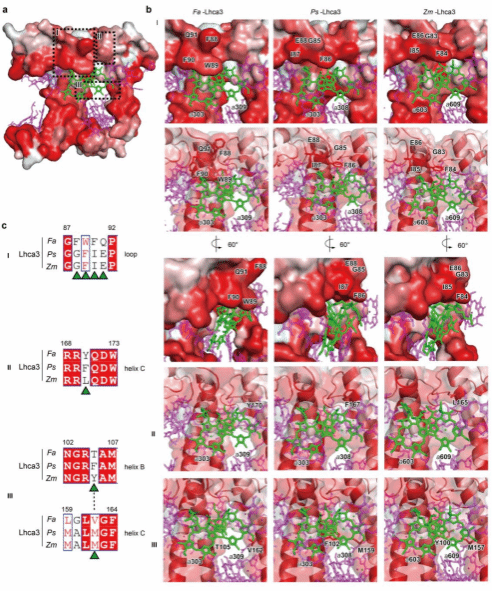 通过与其它被子植物PSI-LHCI对比,观察到Fa Lhca3的red Chls周围存在3处特殊的微环境,推测它们可能是调整red Chl能级的关键位点(图3)。