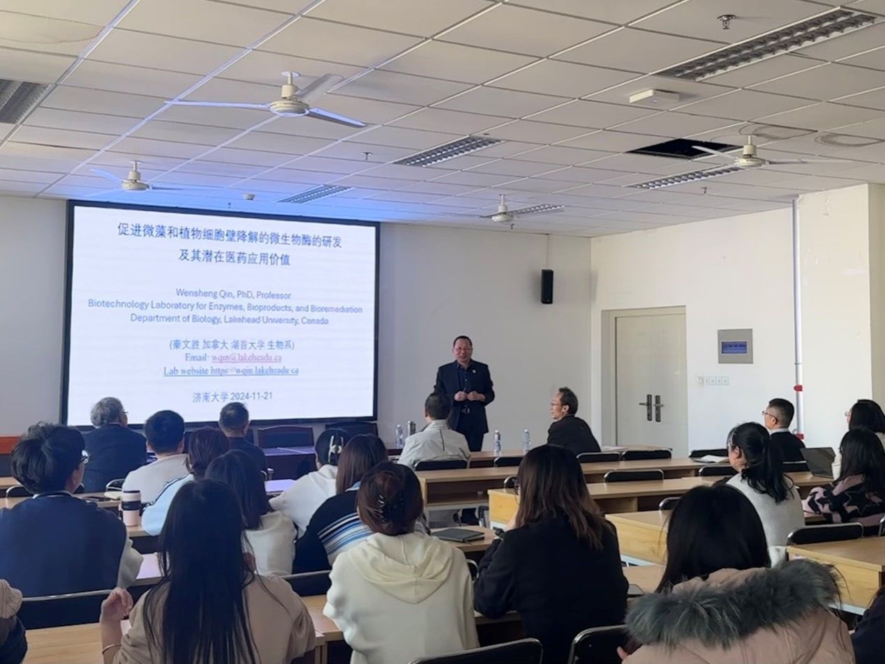11月21日,加拿大湖首大学(Lakehead University)终身教授秦文胜应邀来太阳成集团tyc33455开展交流,并以“促进微藻和植物细胞壁降解的微生物酶的研发及其潜在医药应用价值”为主题作学术报告,学院教师、学生代表参加活动。报告会由副院长李强主持。