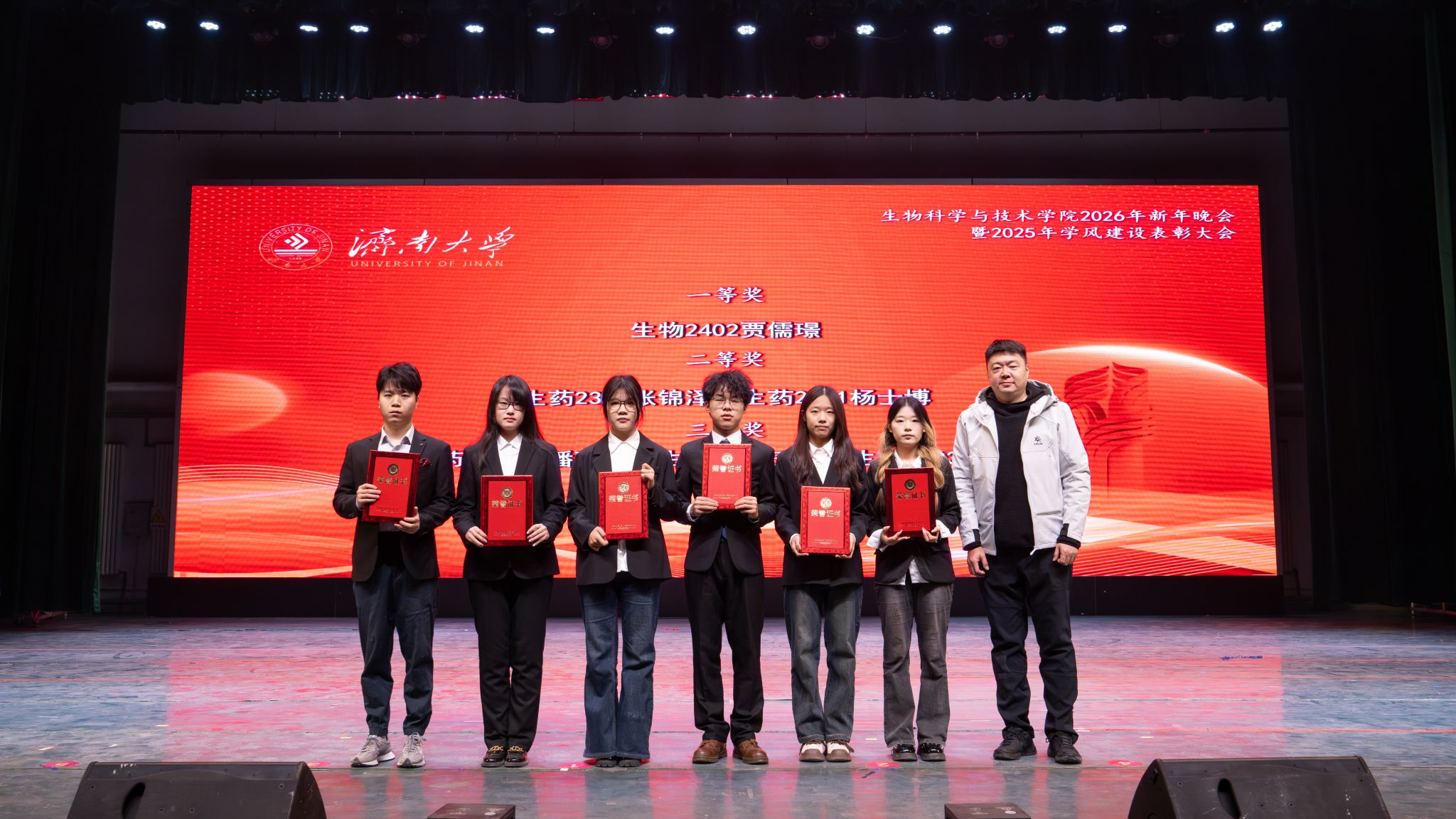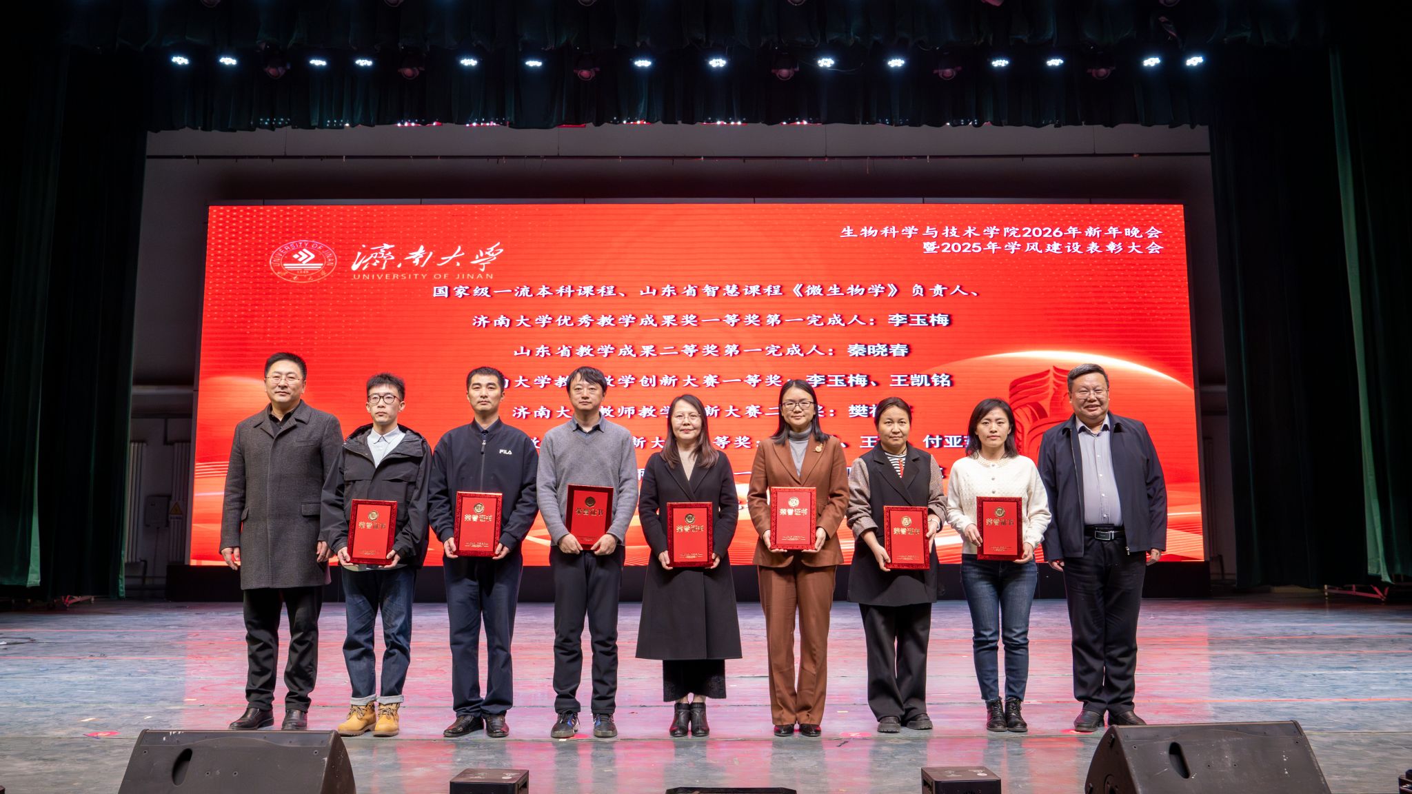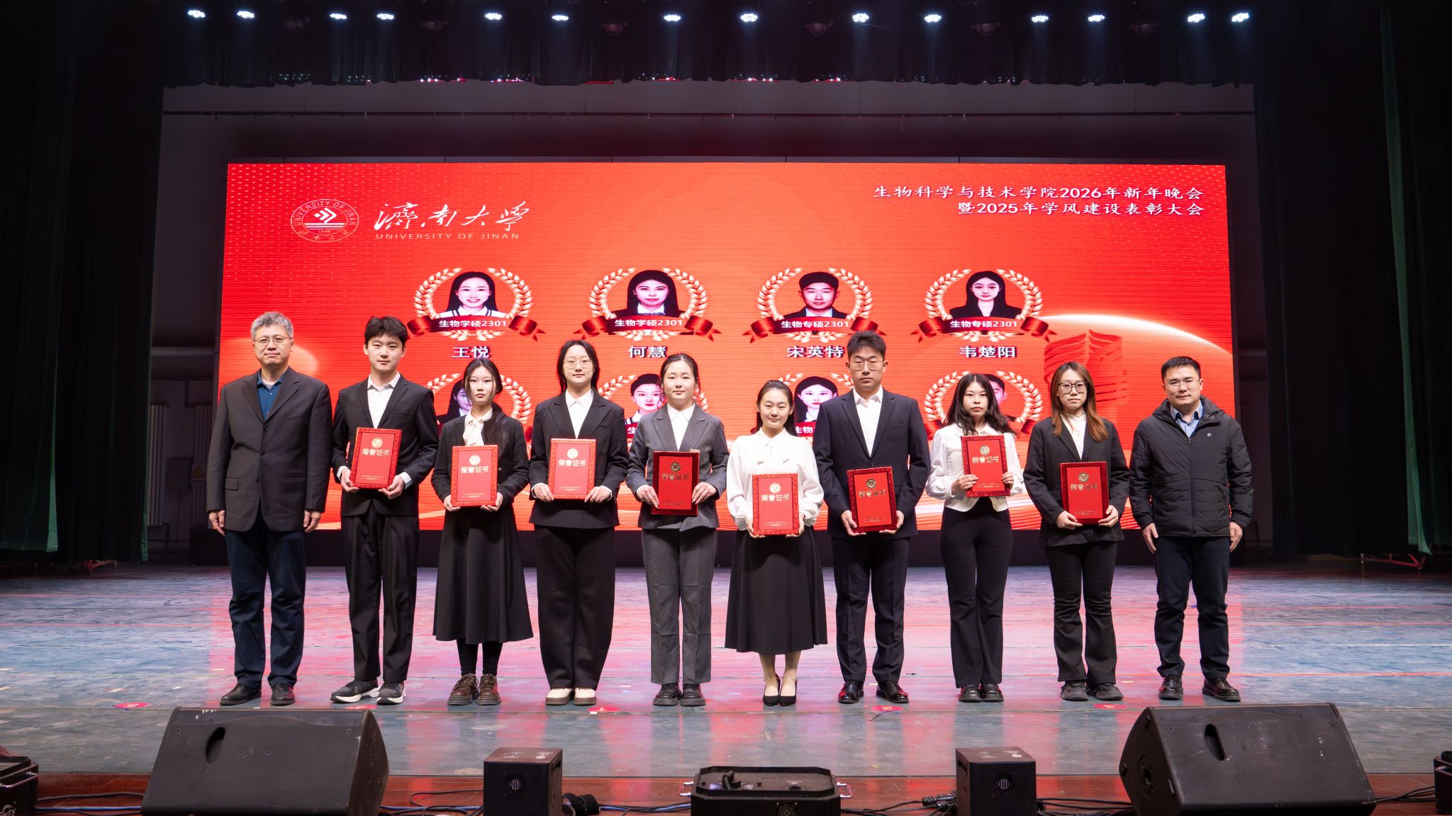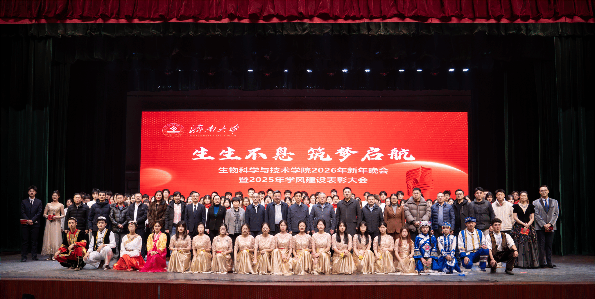弦歌不辍,薪火相传。本次新年晚会暨学风建设表彰大会既是一场精彩纷呈的视听盛宴,更是一次涤荡心灵的精神洗礼、凝心聚力的生动实践,生动展现了太阳成集团tyc33455深耕立德树人、坚持开拓创新的丰硕成果,更彰显出全院师生团结奋进、追求卓越的精神风貌。站在2026年的崭新起点,全体生科人必将以更加饱满的热情、更加昂扬的斗志、更加务实的作风,策马扬鞭、勇毅前行,共同擘画学院发展的宏伟蓝图,为学校高质量发展凝聚共识、汇聚合力,为强国建设、民族复兴贡献生科智慧与力量。