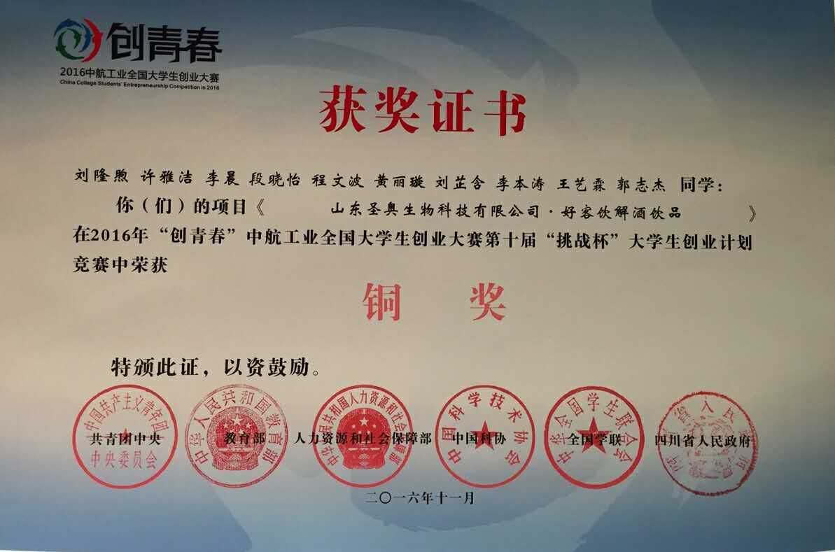 2016年11月15日至20日,由共青团中央、教育部、人社部、中国科协、全国学联、四川省人民政府主办的2016“创青春”中航工业全国大学生创业大赛终审决赛在电子科技大学举行。本届“创青春”决赛主题为“筑梦青春 创享未来”,共有362个项目进入终审决赛,三项主体赛事和主题活动规模6500余人,其中参赛学生423队(含境外高校),约1700人。本届大赛参赛作品数、参赛团队数和参赛学生人数均为历次大赛之最。太阳成集团tyc33455入围的由谷劲松教授指导的实践类作品《山东圣奥生物科技有限公司·好客饮解酒饮品》在2016年全国大学生“创青春”创业大赛中荣获全国铜奖。