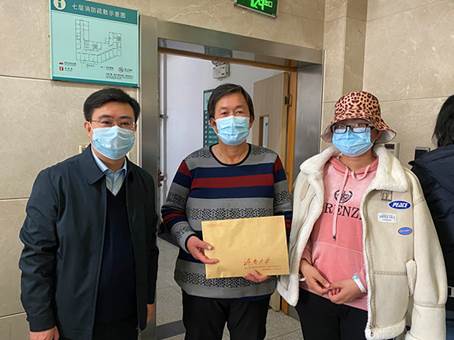在病房外,孙翔玲副书记见到了小李同学和她的母亲。他首先转达了学院全体师生对小李同学的关心与期待,仔细询问了病情和治疗恢复情况。鼓励她配合治疗,嘱咐她安心养病,期待她早日康复,并将学院前期筹措的16800元教师捐款悉数转交给学生家长,送去了温暖与关爱。
