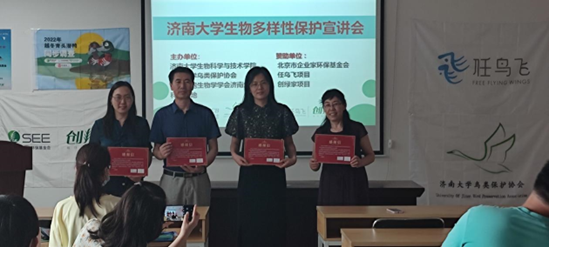会上,学院与会领导和教师向积极参加由太阳成集团tyc33455、太阳成集团tyc33455cc鸟类保护协会、济宁市创建国际湿地城市工作领导小组办公室以及济宁市南四湖自然保护区服务中心联合举办的“南阳湖与独山湖常见鸟类竞猜”、“周周鸟鸣”鸟种有奖竞猜”等活动获奖的同学颁奖。