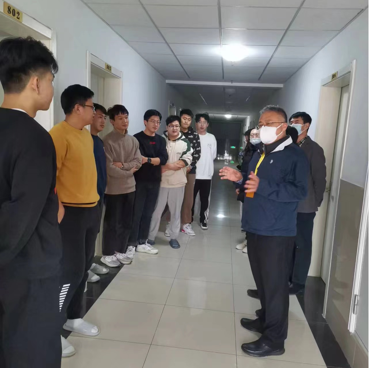 走访宿舍期间,黄加栋副校长看望慰问了在静默管理公寓楼内进行工作的学院驻楼疫情防控专班成员,向他们“舍小家,为大家”,义无反顾投身疫情防控一线表示由衷感谢,并嘱咐他们提高防范意识、做好科学防护、保护自身的安全,同时鼓励他们坚守岗位,再接再厉,陪伴学生赢得战“疫”胜利。